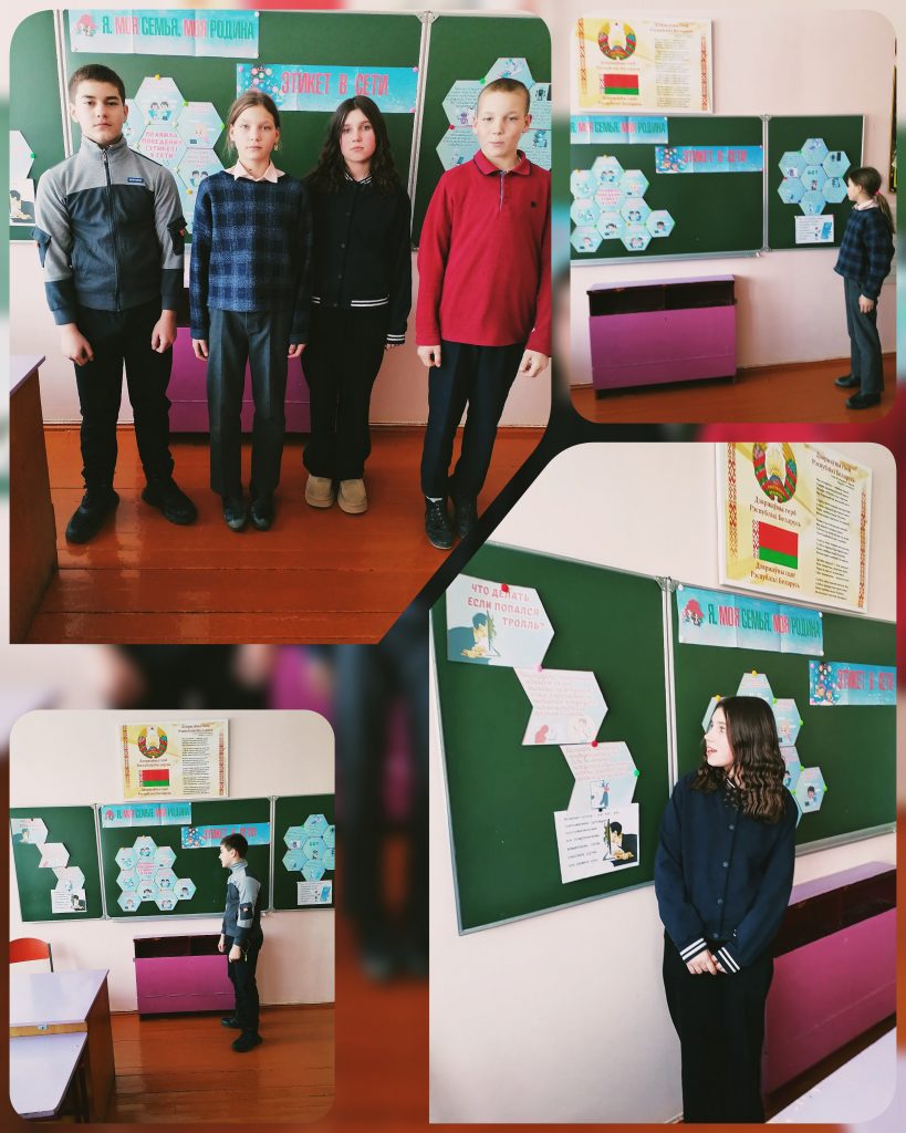 В государственном учреждении образования «Новомарковичская базовая школа Жлобинского района» 16.02.2026 в рамках проекта «Я. Моя семья. Моя Родина» в 7 классе прошел классный час по теме «Этикет в сети». Основной целью классного часа было сформулировать общепринятые нравственные нормы поведения в сети, повышение информационной грамотности учащихся при пользовании ресурсами сети Интернет. Учащиеся обсуждали вопросы конфиденциальности в Интернете, что такое боты и тролли и как защитить себя. В итоге была разработана памятка «Правила общения в чате класса».